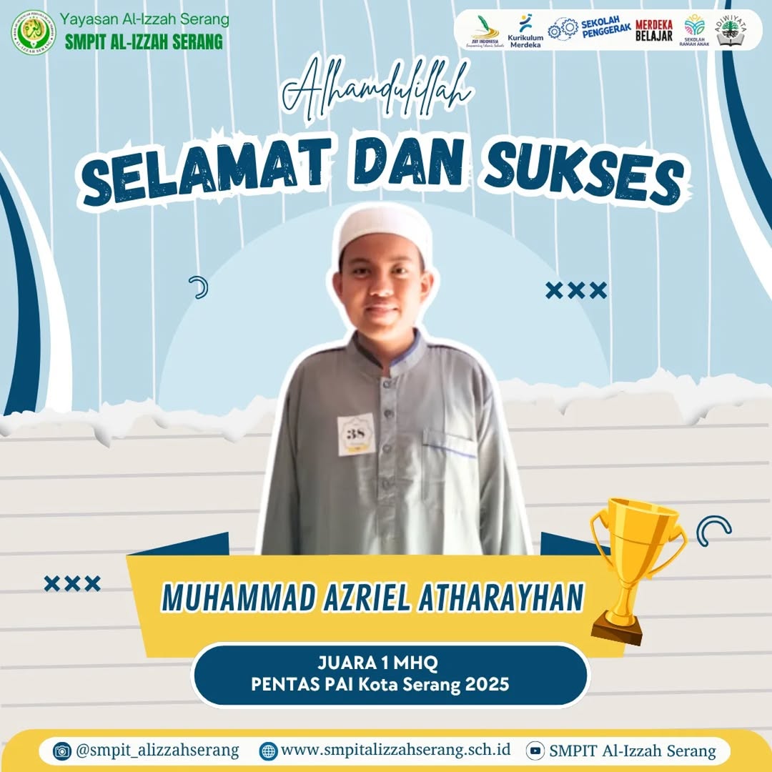Serang, 4 Oktober 2025 — Kabar membanggakan datang dari SMPIT Al-Izzah Serang. Salah satu siswa terbaiknya, Muhammad Azriel Atharayhan, berhasil meraih Juara 1 Musabaqah Hifdzil Qur’an (MHQ) dalam ajang Pentas PAI (Pekan Keterampilan dan Seni Pendidikan Agama Islam) Kota Serang 2025.