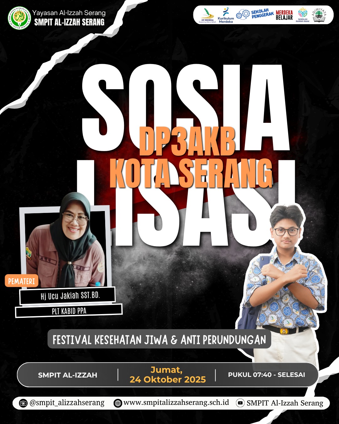 Serang – Suasana SMPIT Al-Izzah Serang pada Jumat (24/10/2025) tampak berbeda dari biasanya. Seluruh siswa mengikuti rangkaian kegiatan Festival Hari Kesehatan Mental Dunia yang diisi dengan berbagai agenda edukatif dan inspiratif. Salah satu kegiatan utamanya adalah Sosialisasi Anti Perundungan yang menghadirkan narasumber dari DP3AKB Kota Serang, Hj. Ucu Jakiah, SST.BD., selaku Plt. Kabid Perlindungan Perempuan dan Anak (PPA).